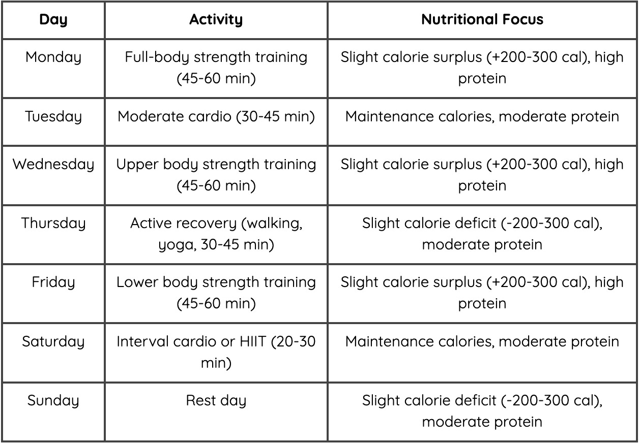 The following plan strategically balances strength training, cardio, and recovery, while providing nutritional guidance for each day: